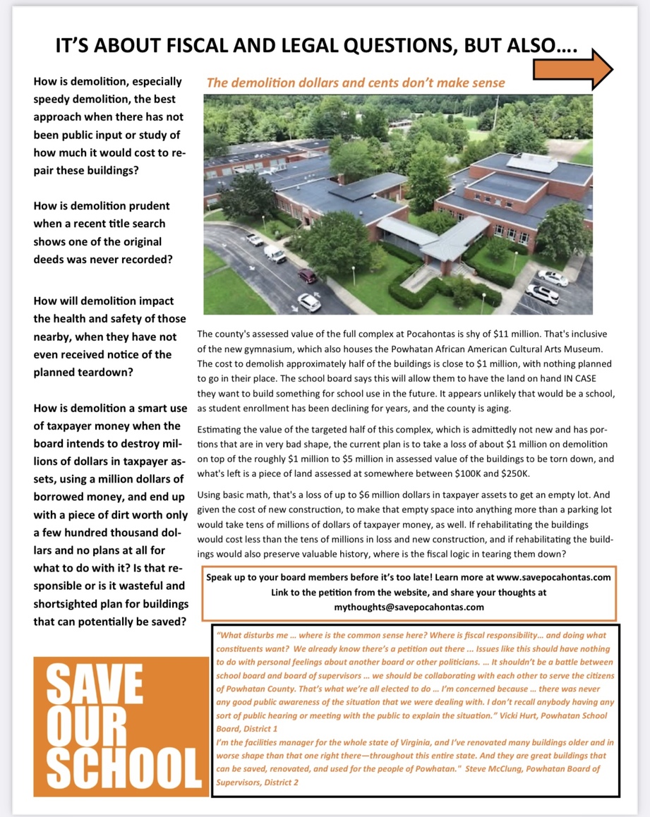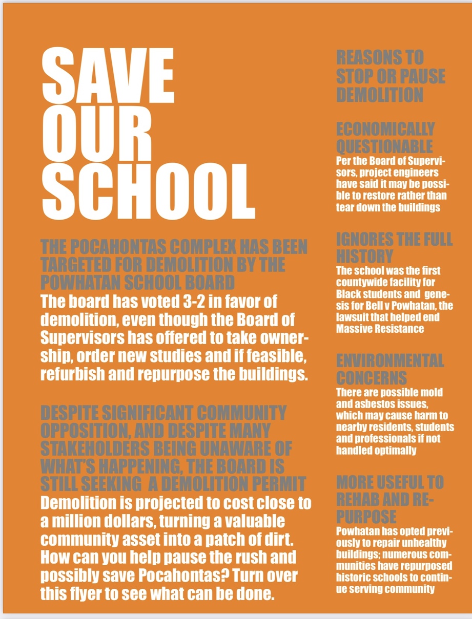 The Powhatan Board of Supervisors has requested that the school board relinquish ownership of the property to allow time to study the feasibility of rehabilitating and repurposing the structures. The school board, by a margin of 3-2 has thus far refused to change course. They are seeking a permit to begin demolition at a cost of nearly a million dollars and possibly more.